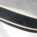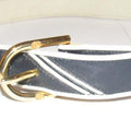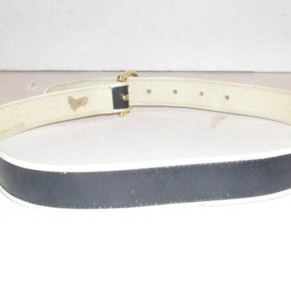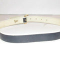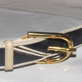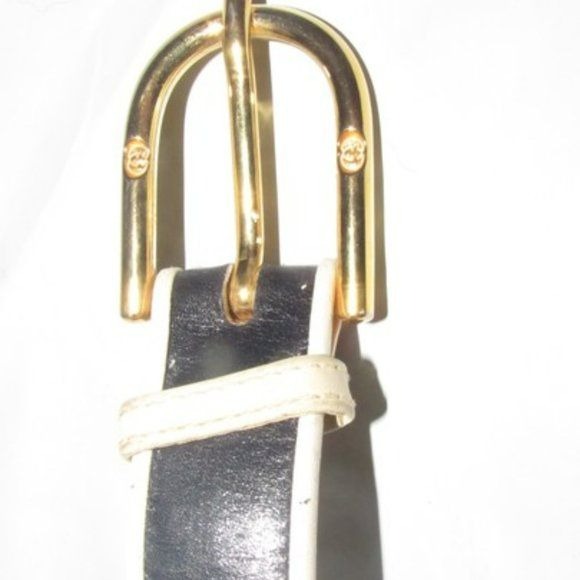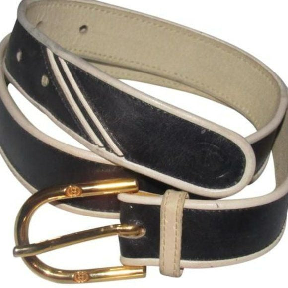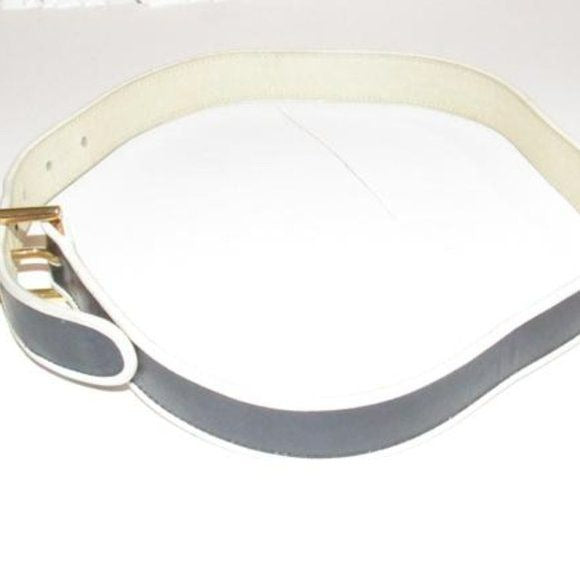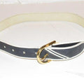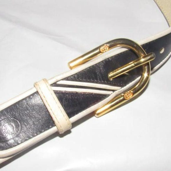 Vintage, early Gucci, navy blue leather belt with an oval shaped gold tone buckle engraved with Gucci GG logo, white piping on both sides, and a timeless nautical look!