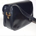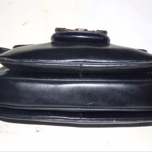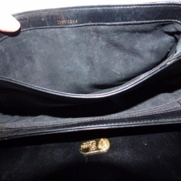It is a large, envelope top, shoulder bag made of supple black leather with a large gold equestrian accent at the center where it closes & sides where the strap is attached. The multi-compartment purse has an expandable, accordion style bottom, so it can hold a lot more than you might think & the strap has 2 settings. The bag's suede lining is very clean with no signs of peeling & the serial #22.001.2064.