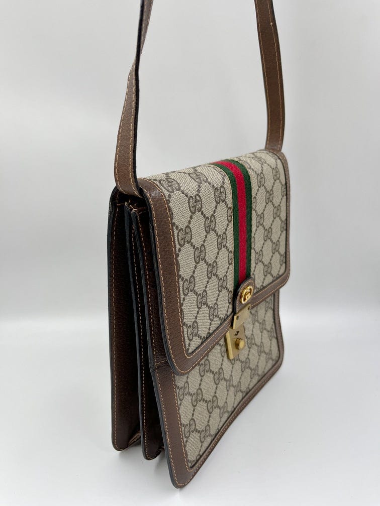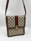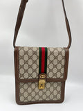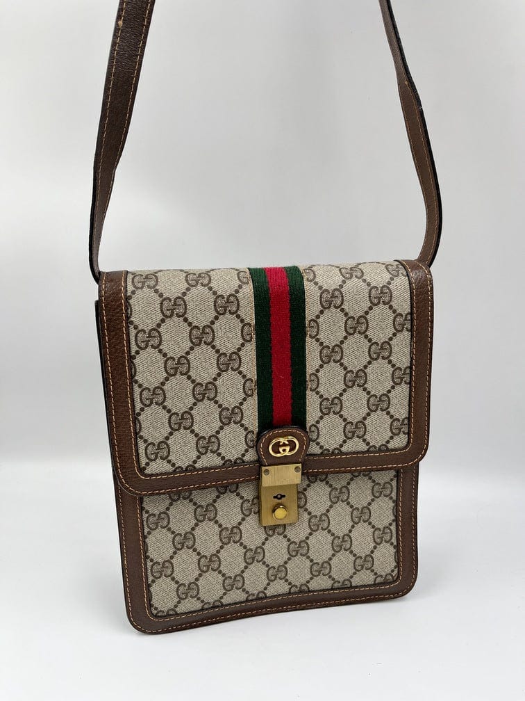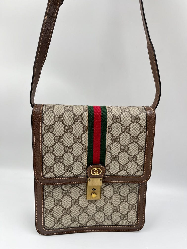 A beautiful vintage Gucci crossbody bag. Made from the iconic GG beige canvas with brown leather trim and gold hardware. This bag is from the 80's.