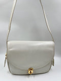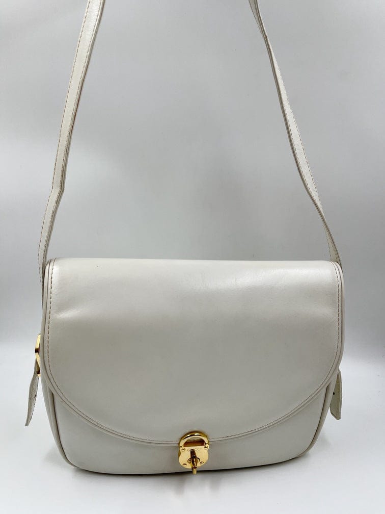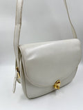 A stunning vintage Gucci crossbody bag made from off-white leather with gold Gucci branded hardware. Featuring the sought after vintage Gucci padlock twist lock.