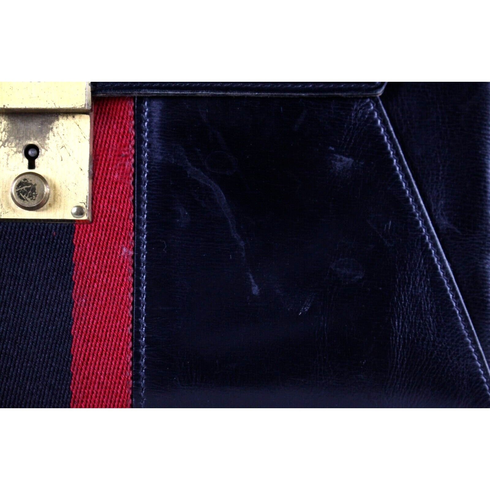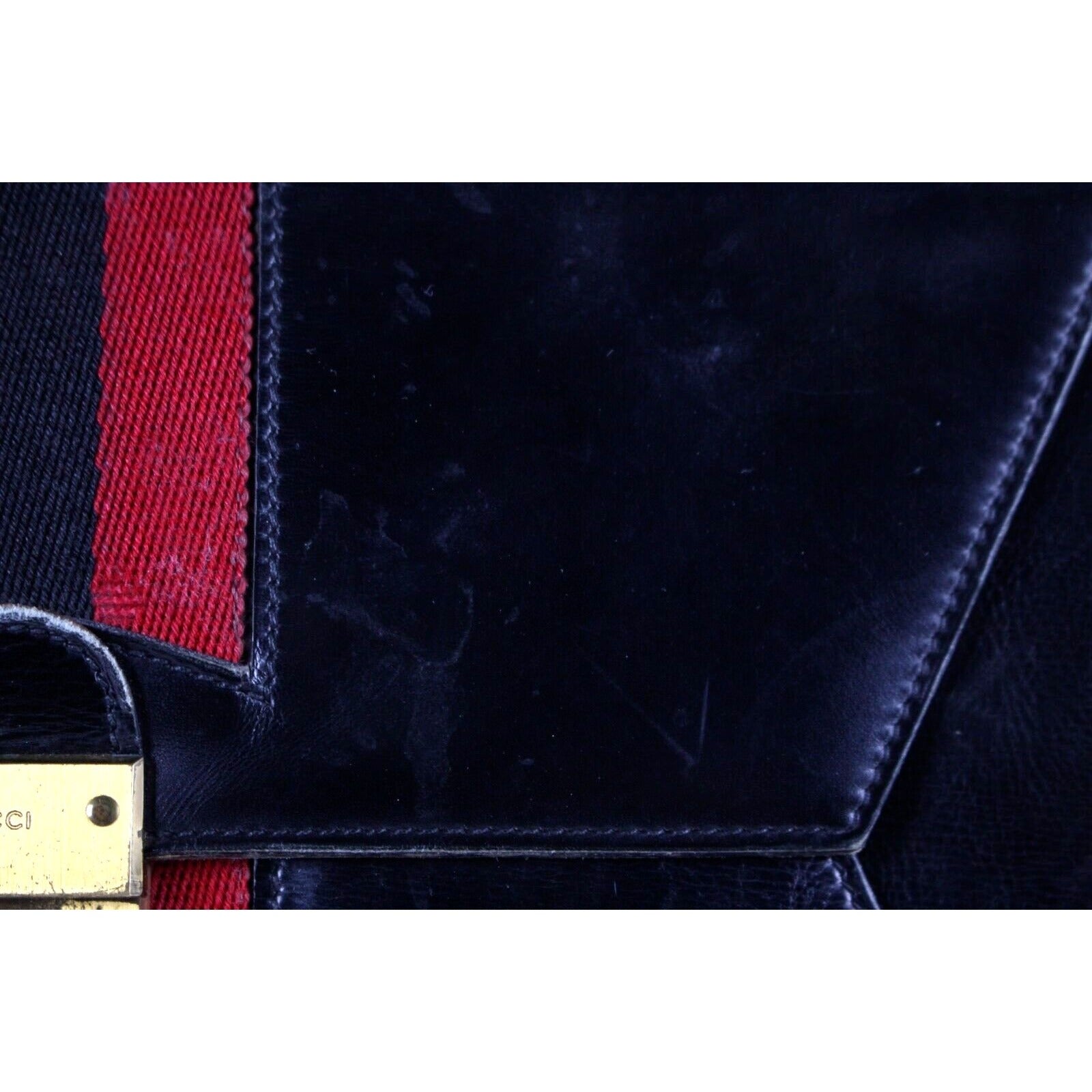 For sale is an amazing, vintage, Gucci, midnight blue leather, clutch, portfolio, or tablet holder with a wide, red and navy Sherry stripe, an envelope top, multiple compartments, exterior pockets, and a push lock closure! It is a rare, early style in a hard to find color from Gucci that would be a great used as a clutch purse or a tablet holder!