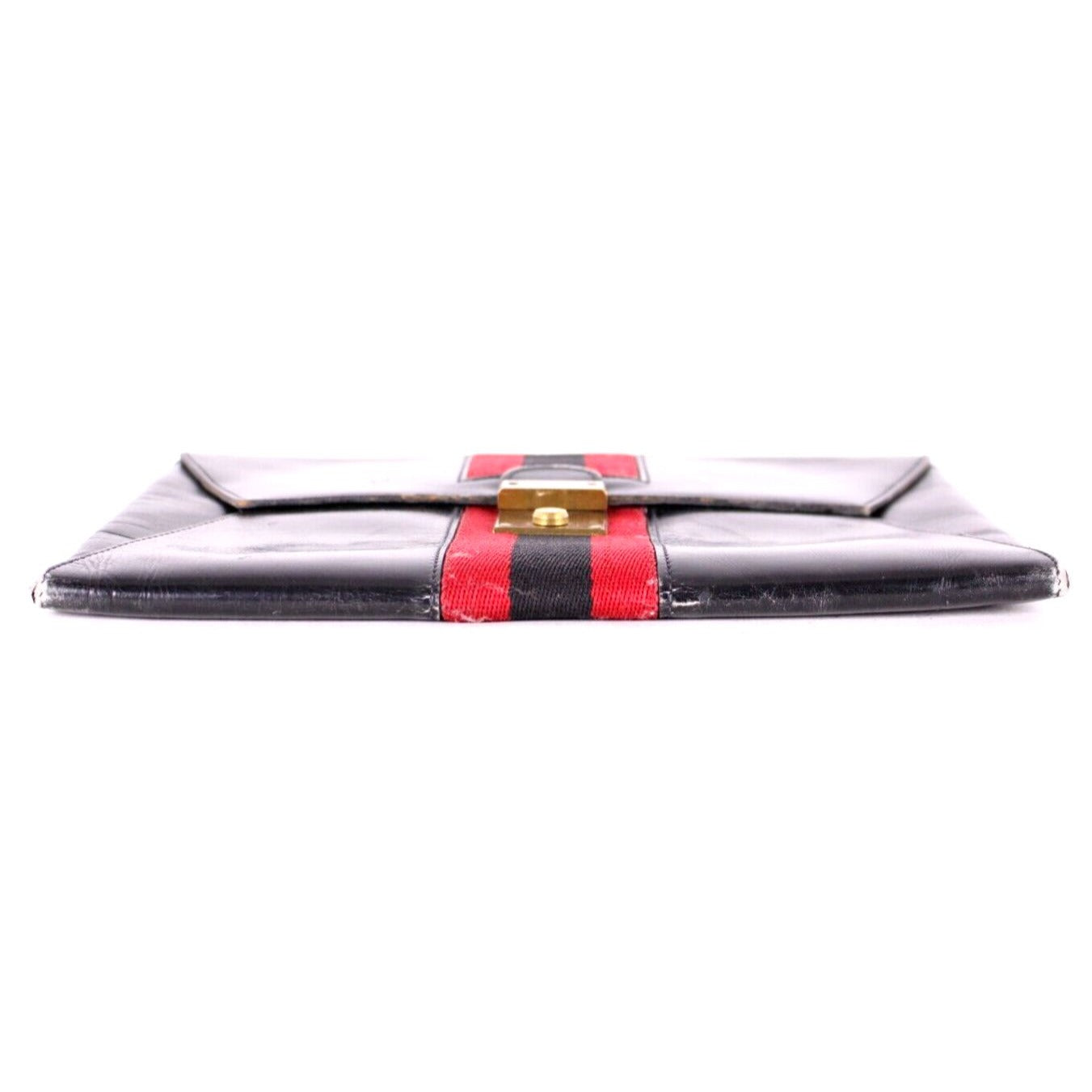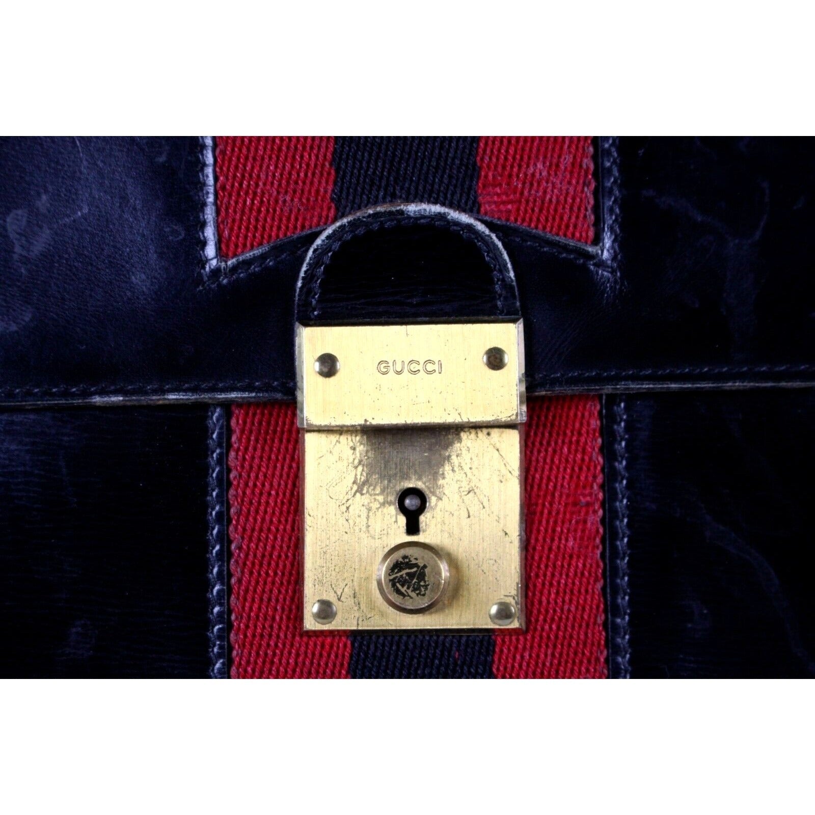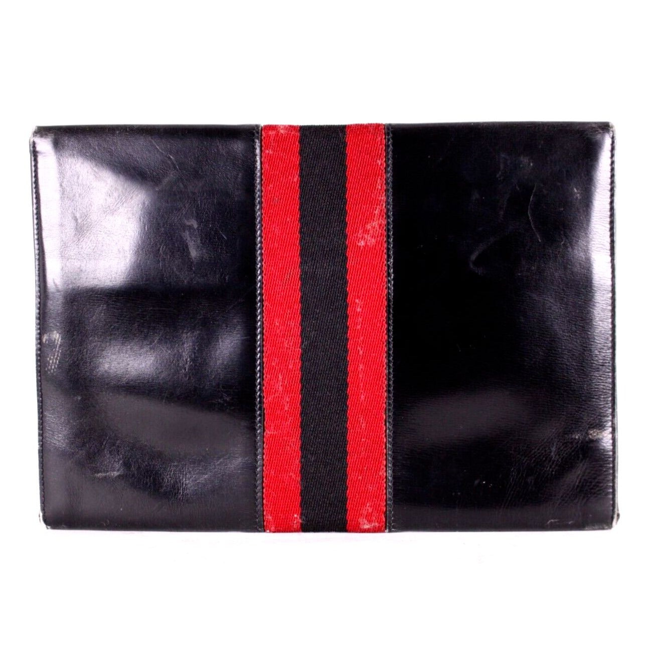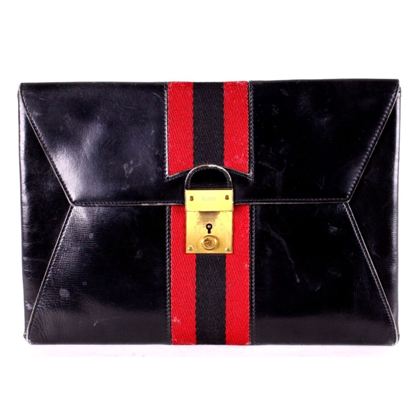In their Ophidia line, Gucci has many styles that are almost identical to the look of this bag! It is made of bluish black leather with a wide, red and navy Sherry stripe down the center. The bag is more of a clutch style purse, but would also work well as a tablet holder. The bag has an envelope top, multiple pockets, a push lock closure, two exterior pockets under the slanted leather trim, and gold hardware. It is an early vintage style from Gucci that is in amazing mint vintage condition!