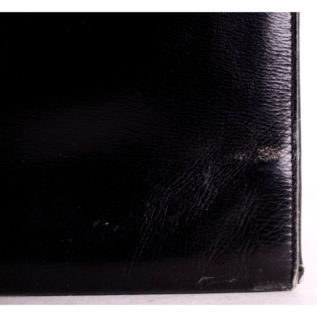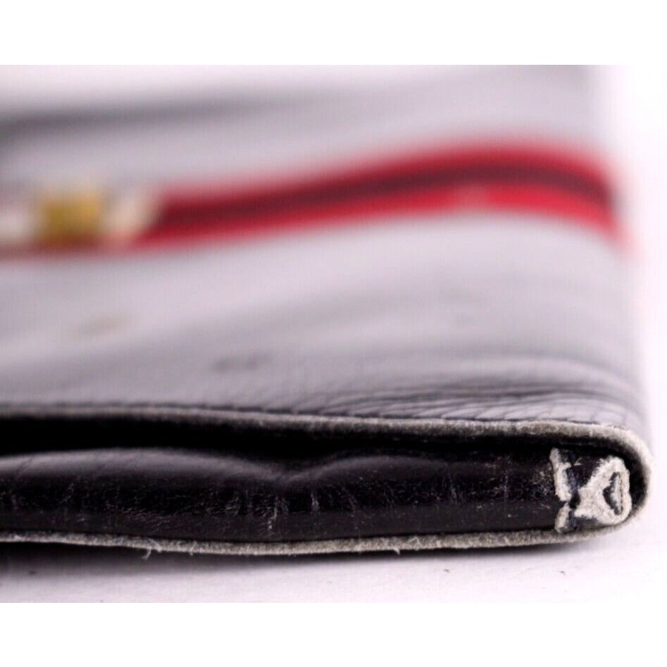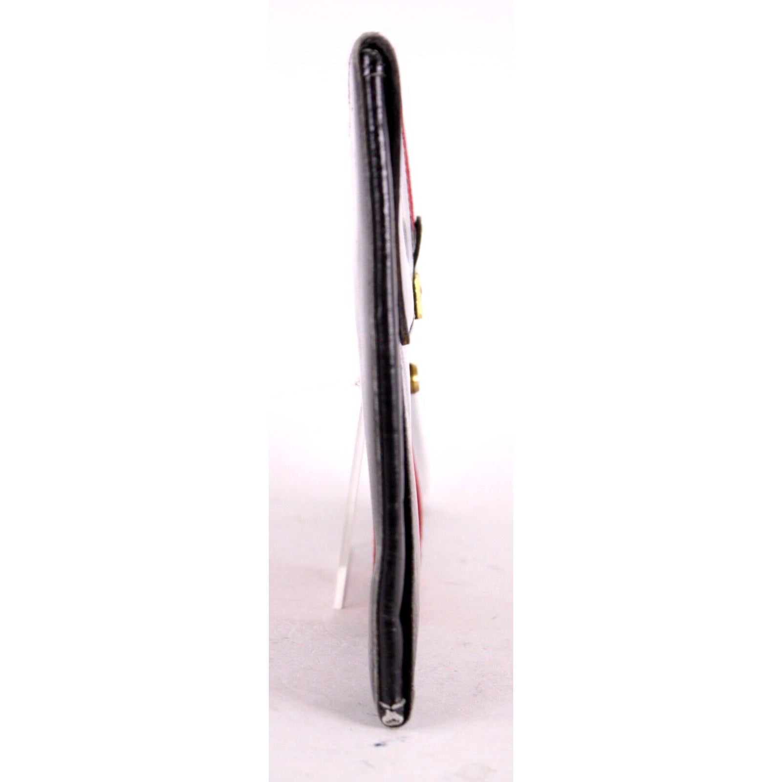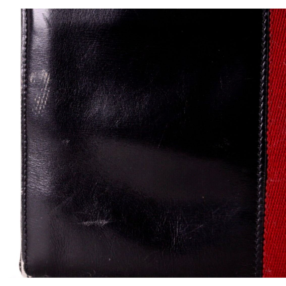 In their Ophidia line, Gucci has many styles that are almost identical to the look of this bag! It is made of bluish black leather with a wide, red and navy Sherry stripe down the center. The bag is more of a clutch style purse, but would also work well as a tablet holder. The bag has an envelope top, multiple pockets, a push lock closure, two exterior pockets under the slanted leather trim, and gold hardware. It is an early vintage style from Gucci that is in amazing mint vintage condition!