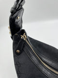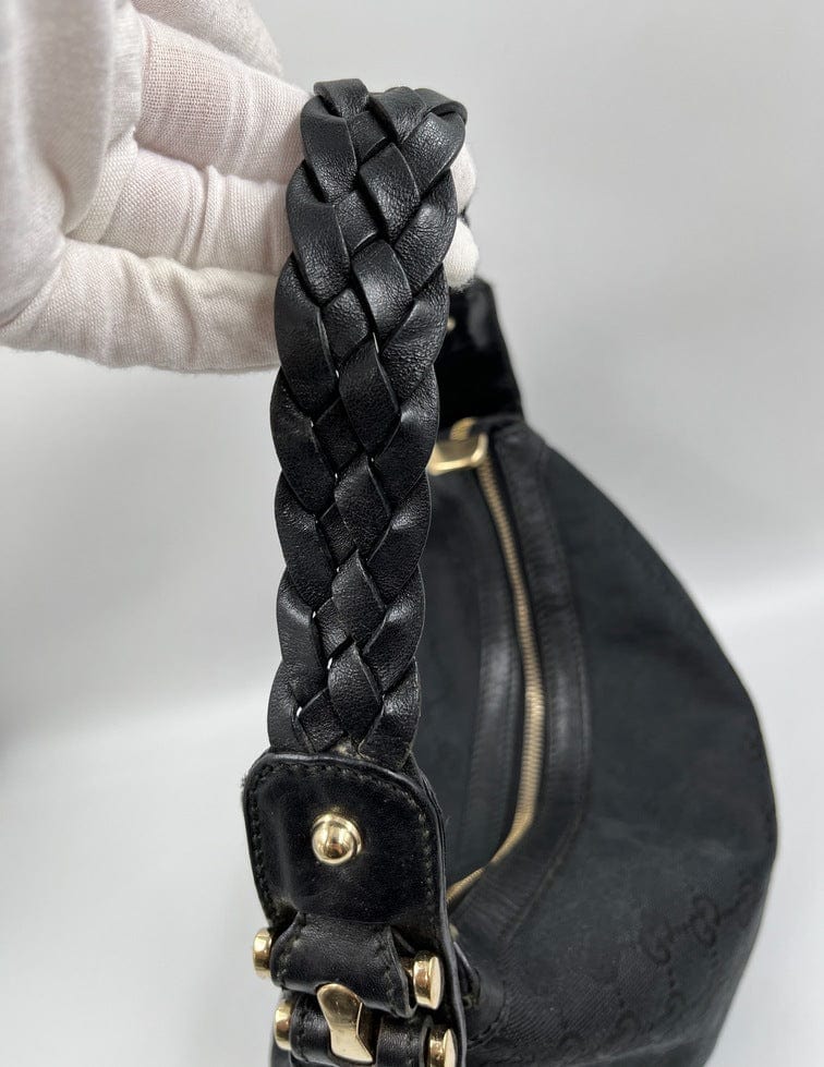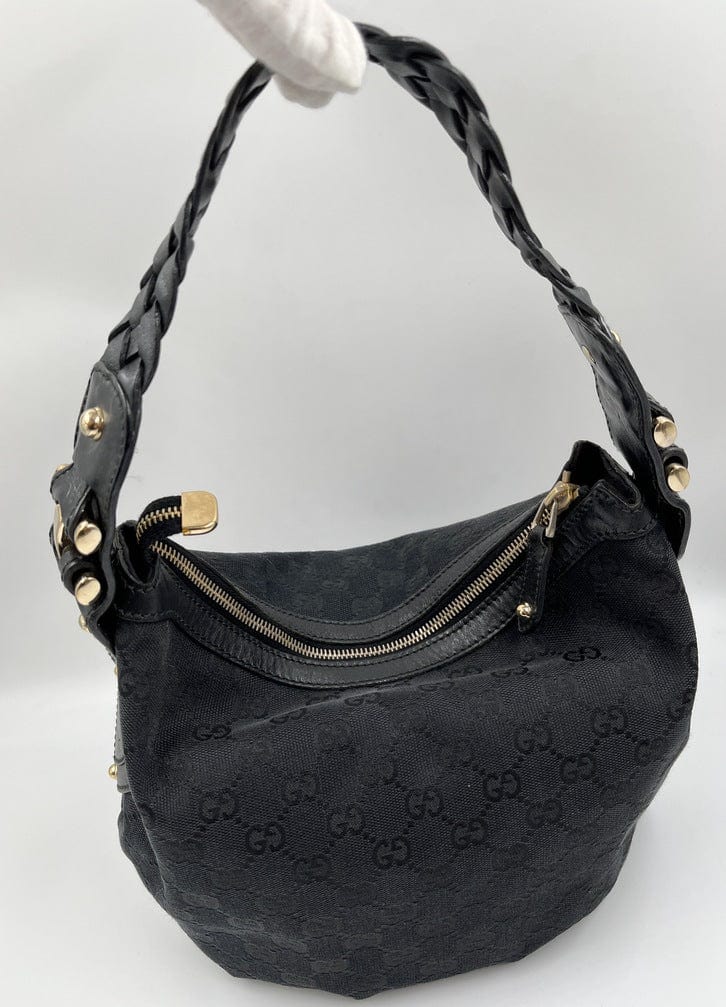 A stunning vintage Gucci shoulder bag made from the iconic GG black canvas with a black braided leather top handle and chunky pale gold hardware.