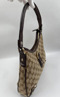 A stunning vintage Gucci trapeze shoulder bag made from the iconic GG beige canvas with brown leather trim and Gucci branded pale gold hardware.