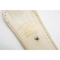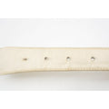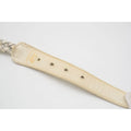 The belt is 1.75" wide at the widest points and is made of two white leather braided strands that are attached, by gold rings. The round, gold buckle with red and blue enamel is an open circle with 37" long x 1.75" to 1.5" wide with four holes from 30" to 33". All measurements are approximate.