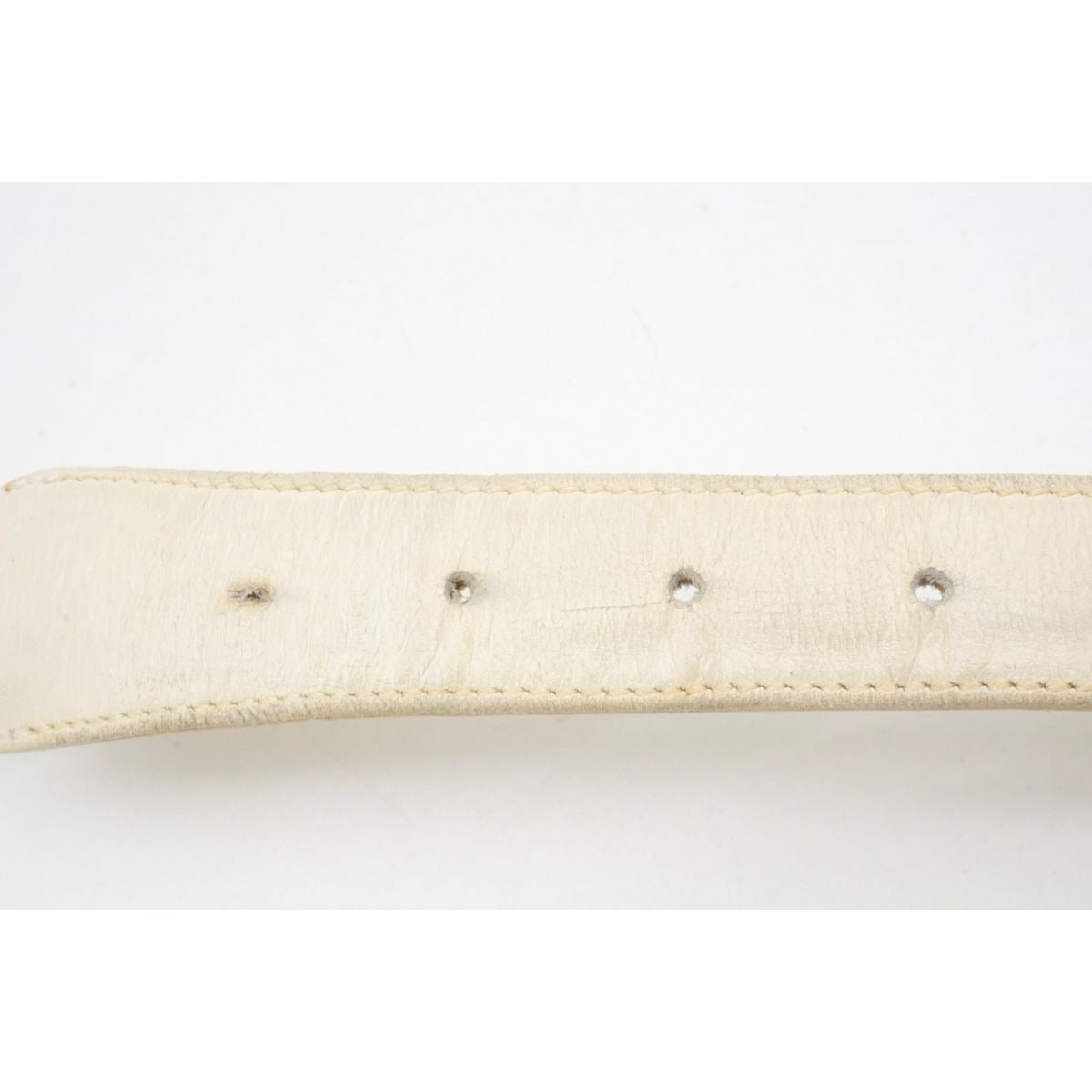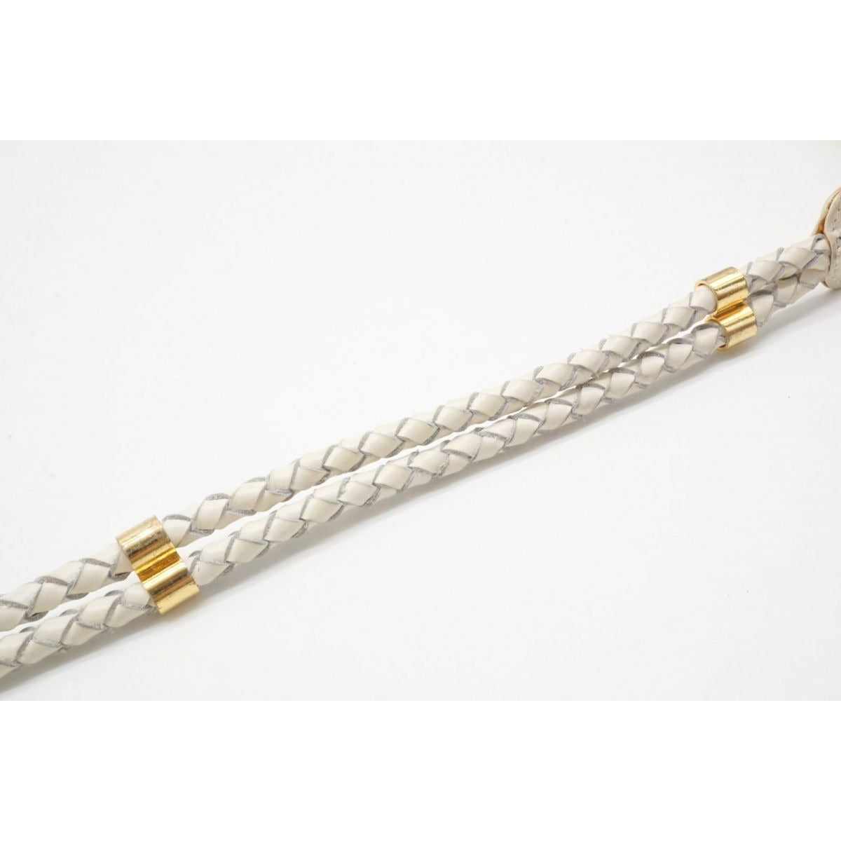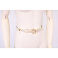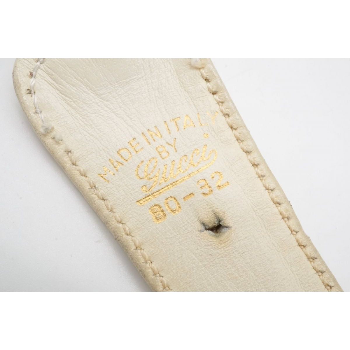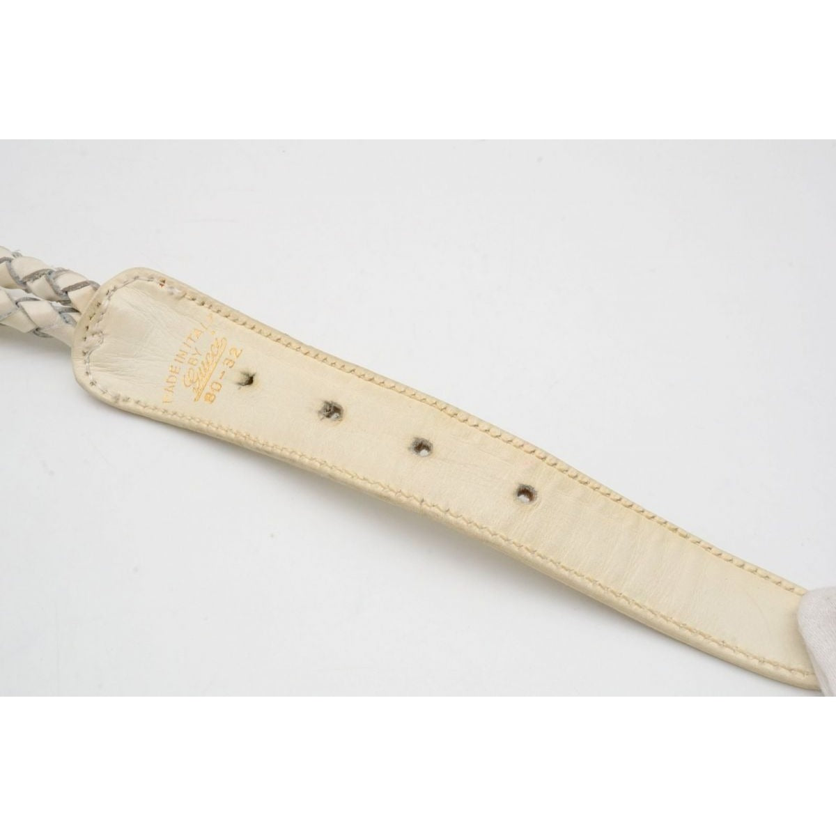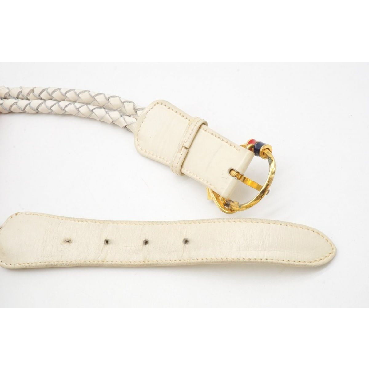 vintage, Gucci, size 80/32, white leather belt with a round, gold buckle with red and blue enamel & two braided leather strands