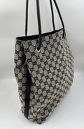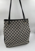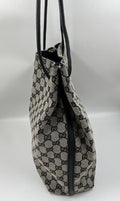 A stunning vintage Gucci tote bag made from the iconic GG beige and navy canvas with navy leather trim and silver hardware.