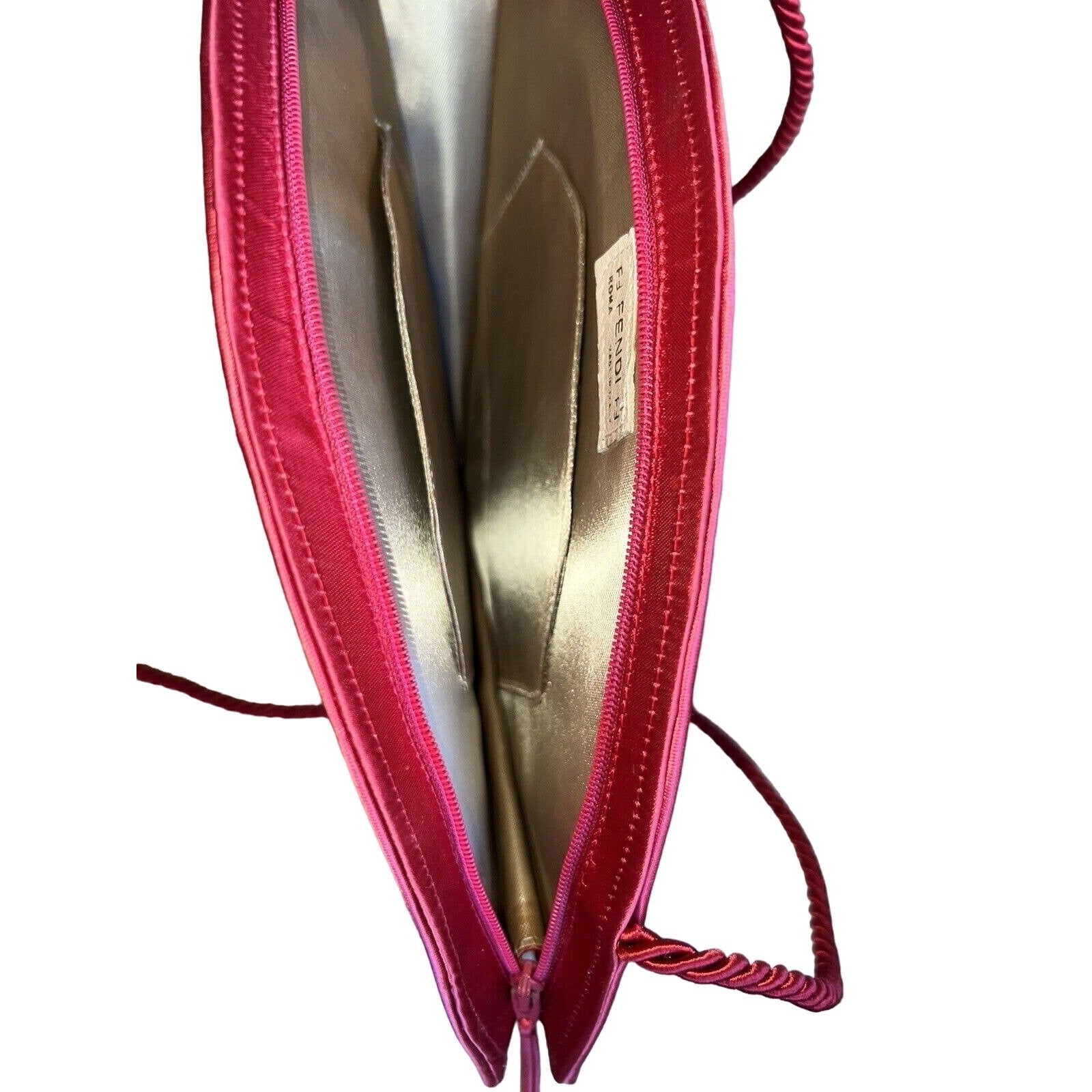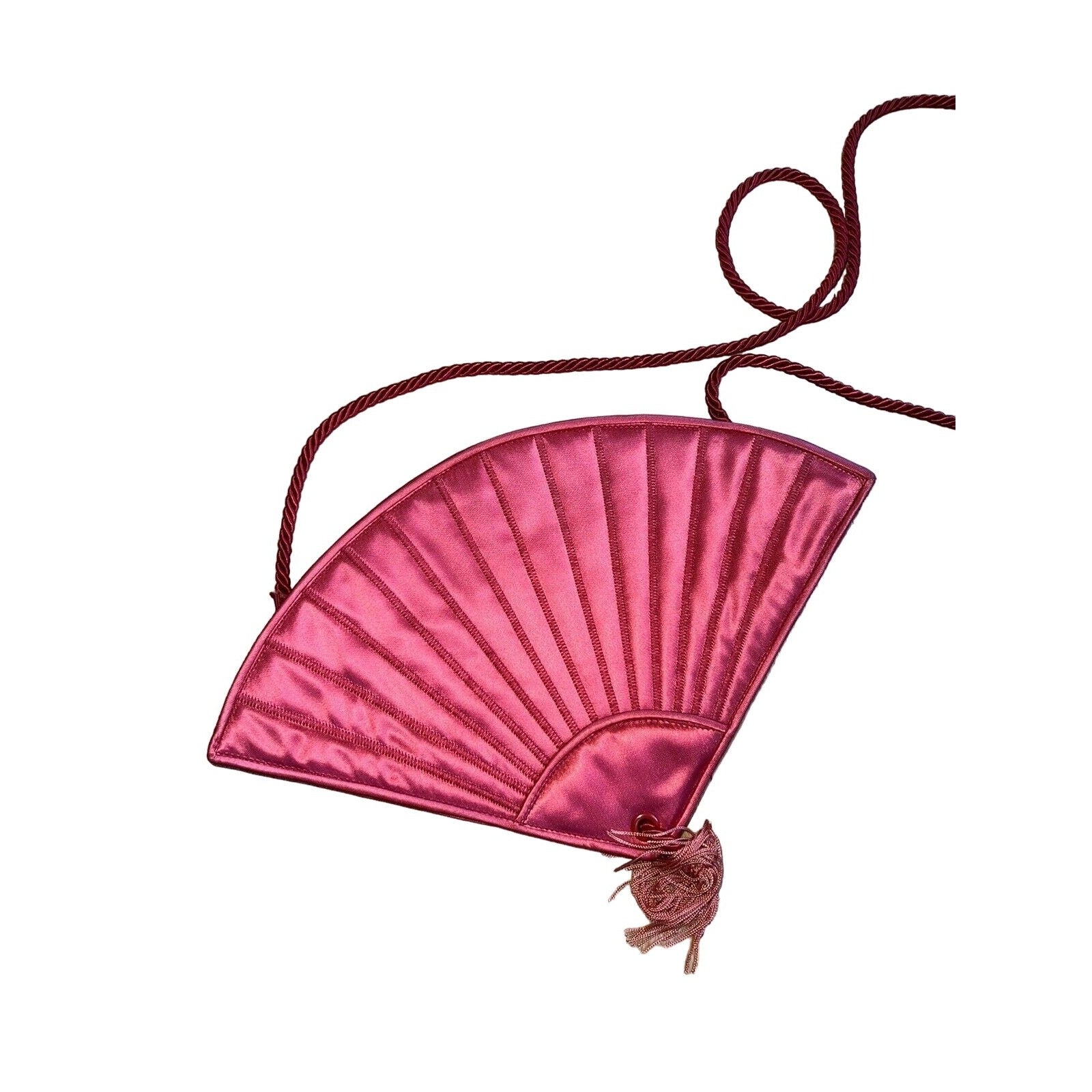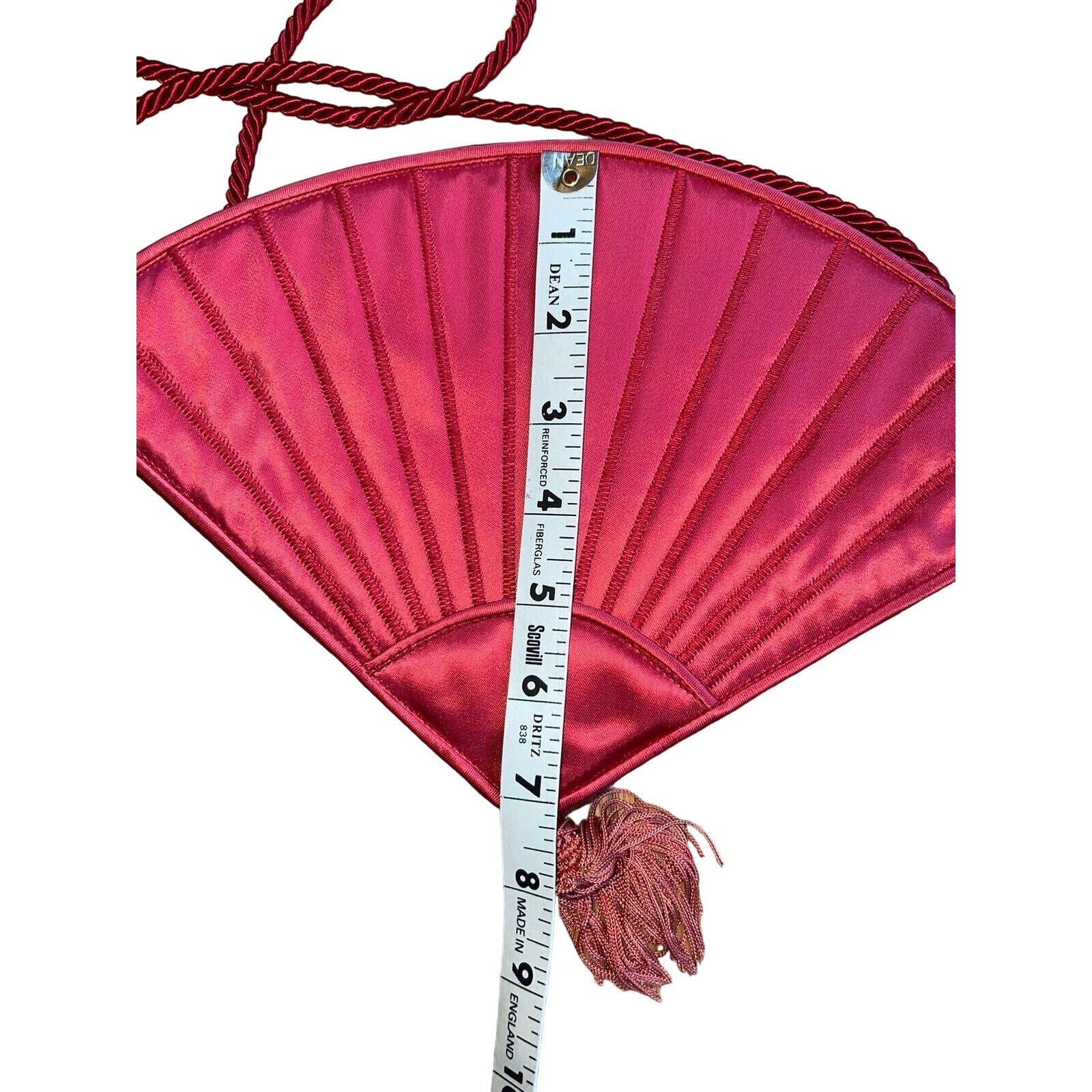 The bag is by Fendi from when Karl Lagerfeld made Fendi his home and is a rare vintage style! It is a scarlet red colored silk over leather, stylized fan shaped two-way cross body, clutch, or shoulder purse with a zip around top closure. The purse has a hard leather front and back expandable sides, so it can hold quite a bit. It has a knotted fringe accent at bottom and a red twisted silky yarn strap that you can use or wear it as a clutch! The interior is very clean gold silk over leather. There is one main compartment and two slot pockets.