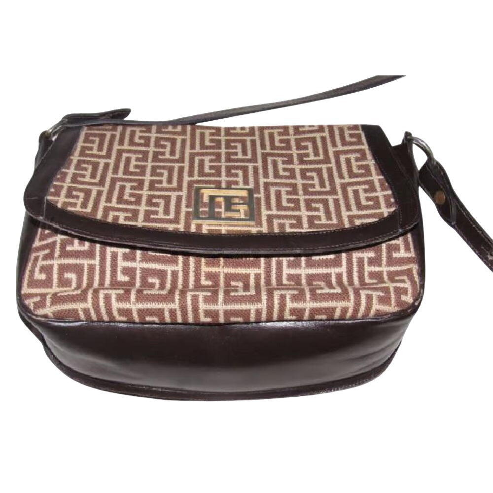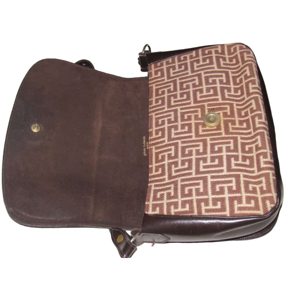 The bag is a classic envelope top, shoulder style in brown and white that forms a geometric pattern that we were told depicted the intricate Paris metro! Matching brown leather frames the bag, doubles as a shoulder strap and expands at the bottom to create a much roomier bag than you think! It features an adjustable and removable leather shoulder strap, multiple compartments and gold hardware. The handbag is an earlier style by Pierre Balmain. It has a classic look that will never go out of style.