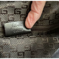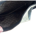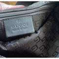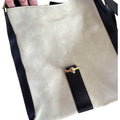 The Tom Ford era Jackie style purse is made of ivory suede with black leather. It has bold gold hardware and a clasp that is like a giant jump ring. The lining is very clean and made of brown fabric with the Tom Ford era square G logo print throughout. It has one large compartment and a zip close pocket. There is a leather embossed tag that reads, 'Gucci. made in italy' and the serial #001 4051 002113 is stamped on the back.