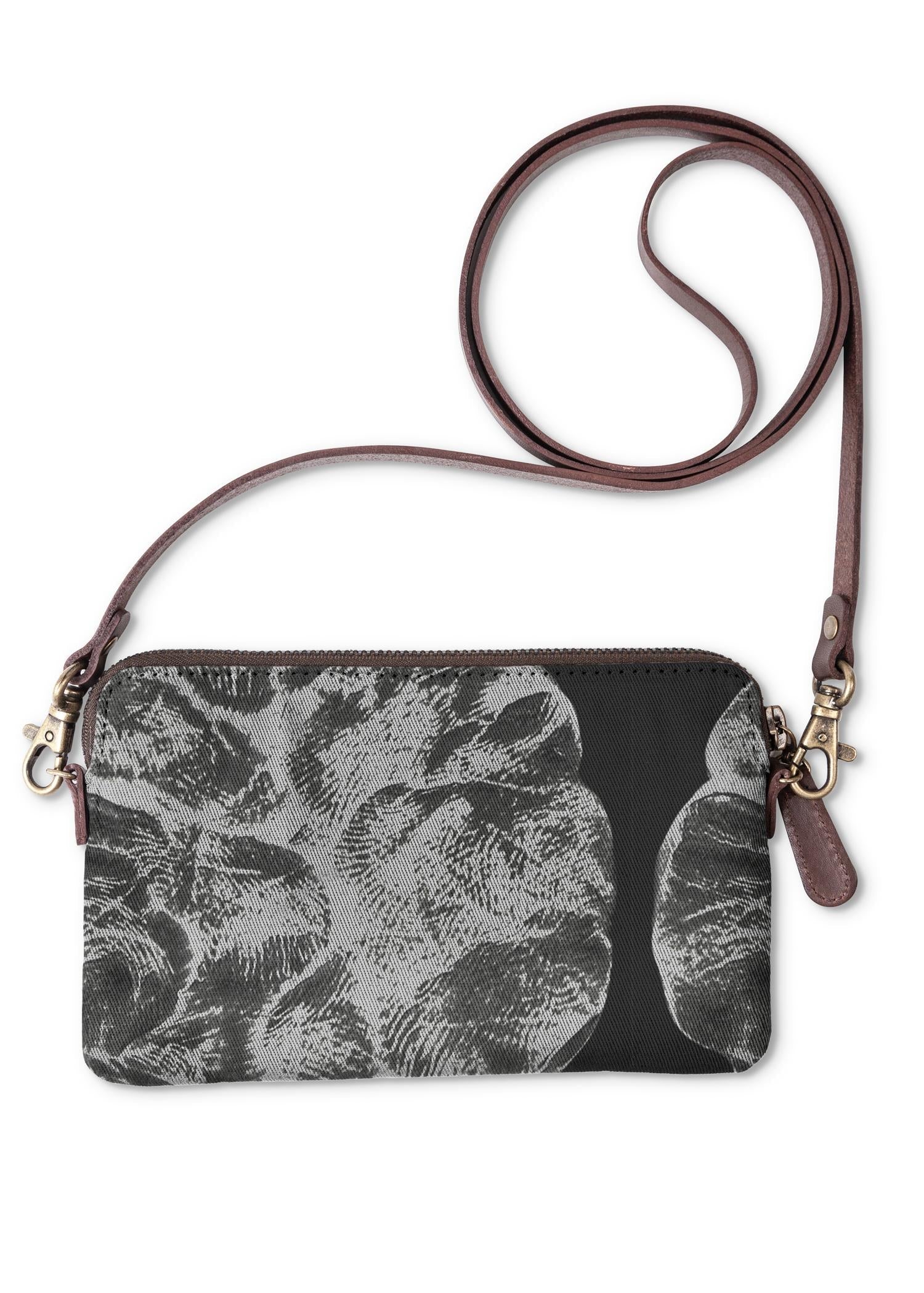 Make a statement with this clutch. Crafted from genuine leather and canvas and adorned with original art by independent designers.