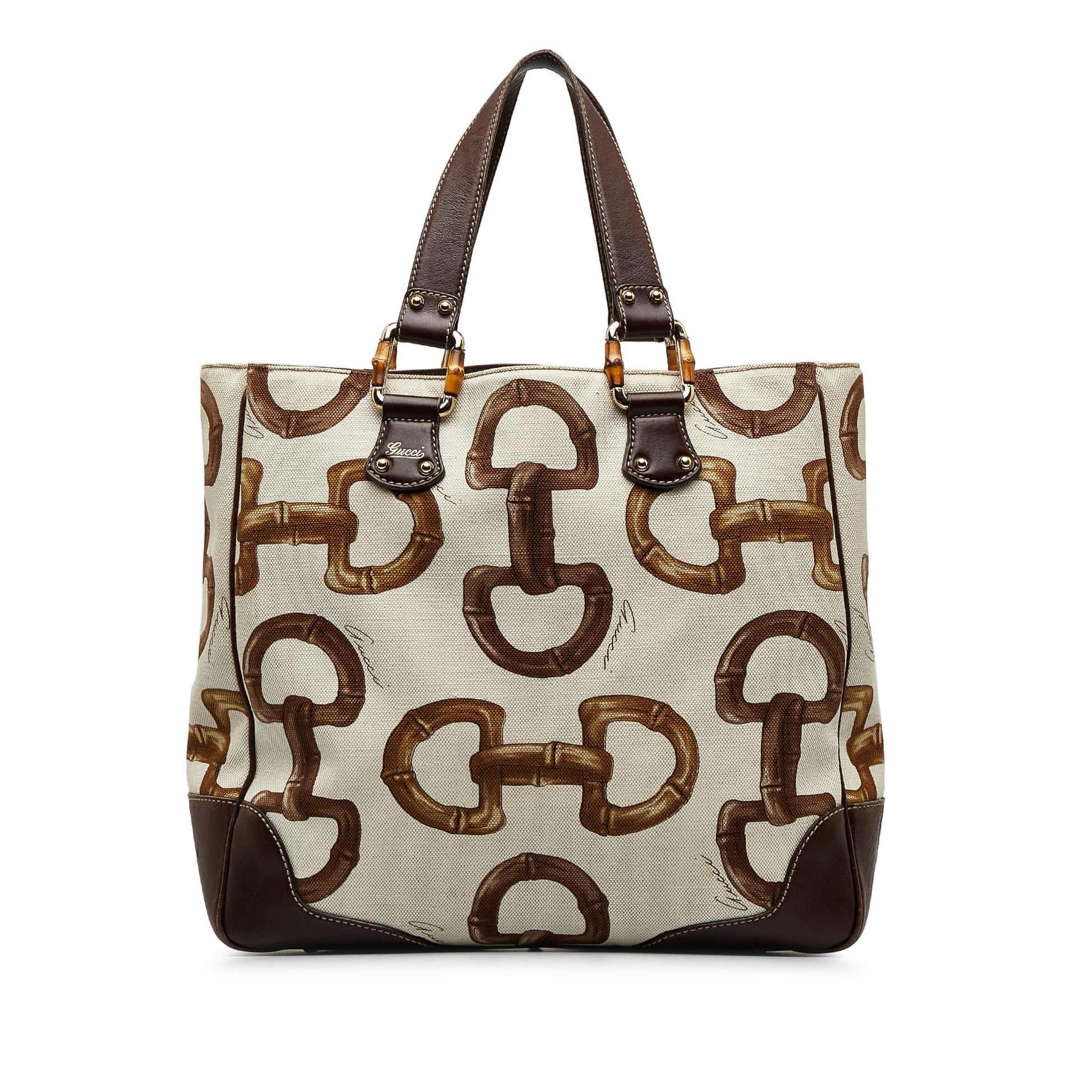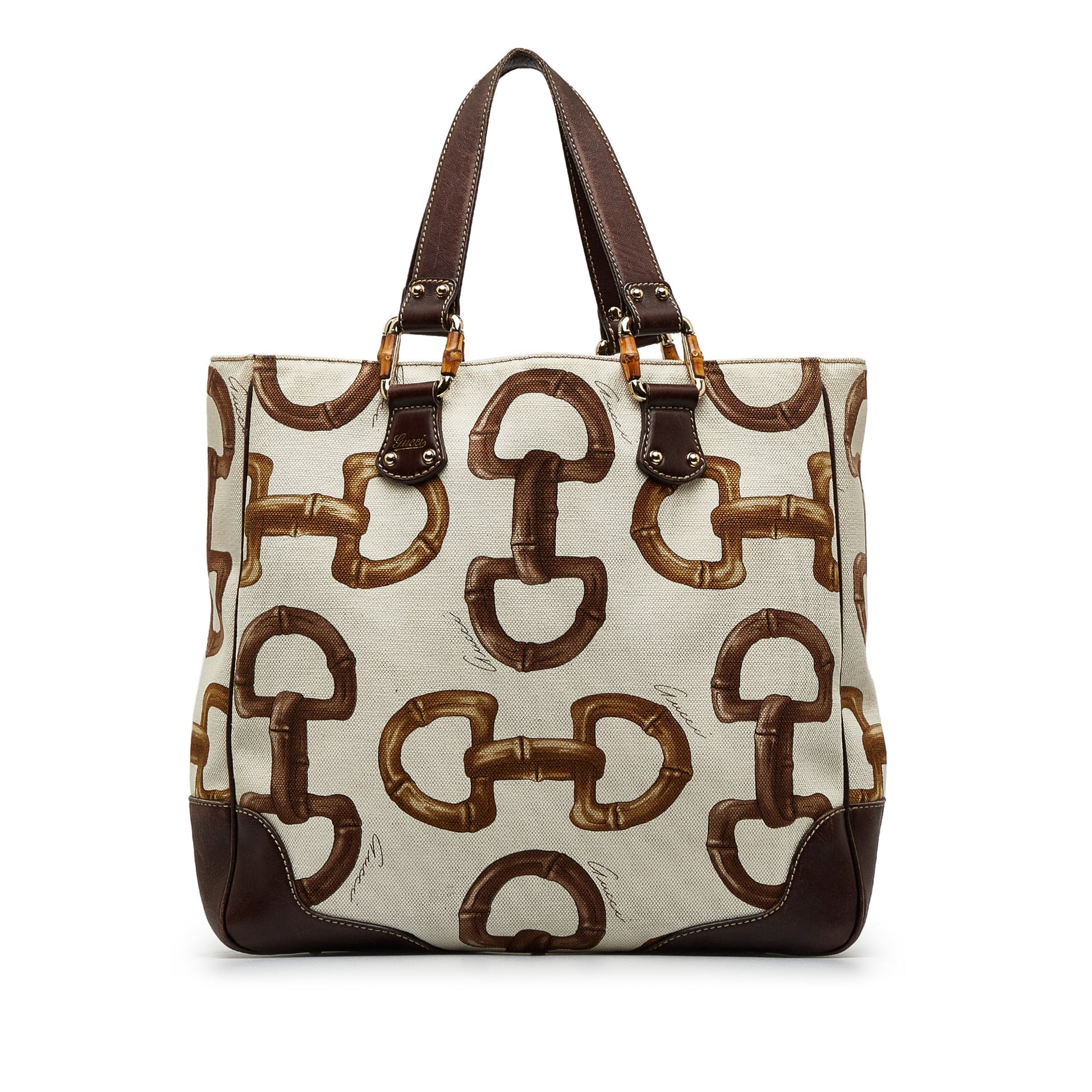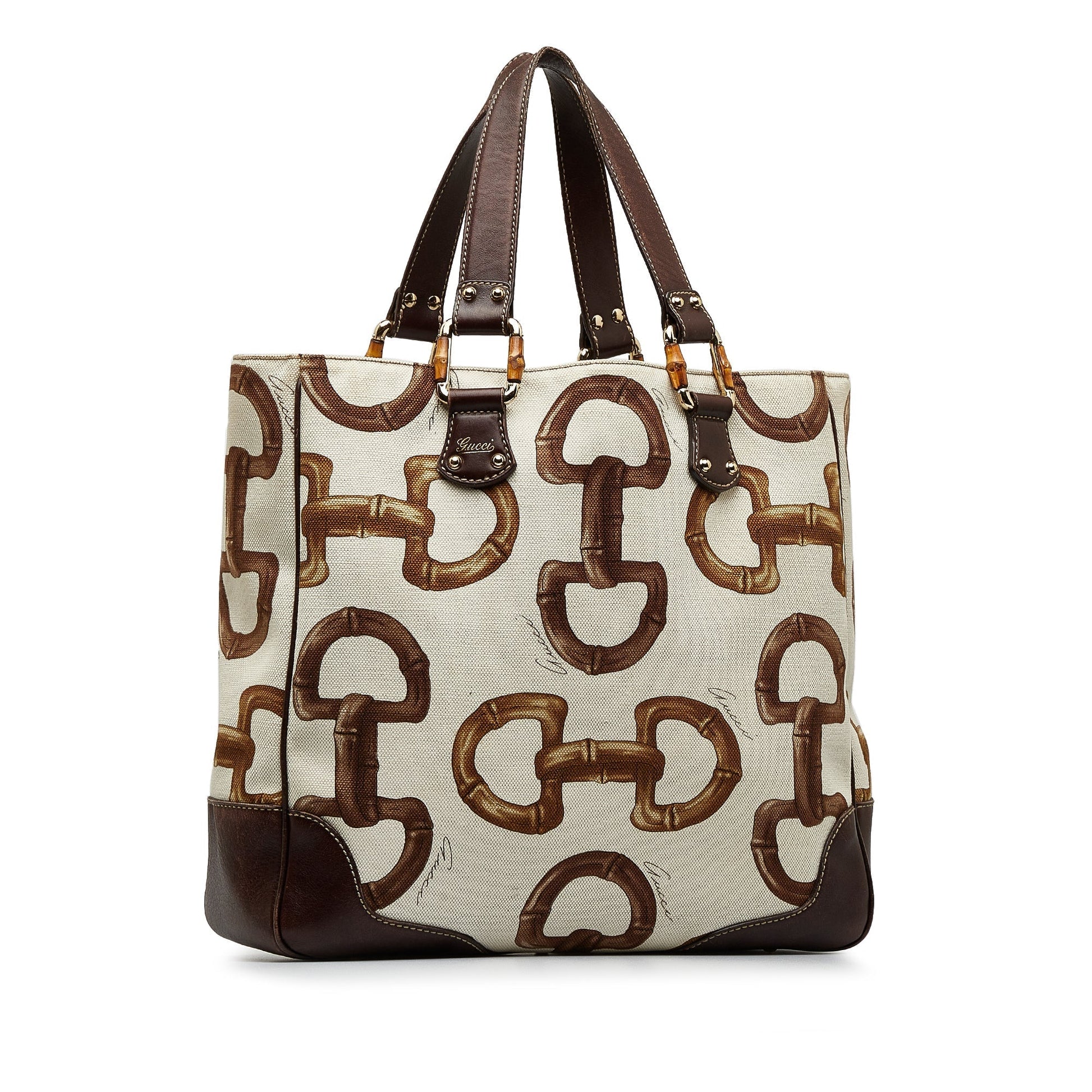 Product Details: White Gucci Bamboo Horsebit Tote. This tote bag features a printed canvas body with leather trim, flat leather handles, an open top, and an interior zip pocket. 12.6" L x 17.1" W x 4.3" D, 6.3" drop. Serial number 154375 001998.