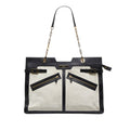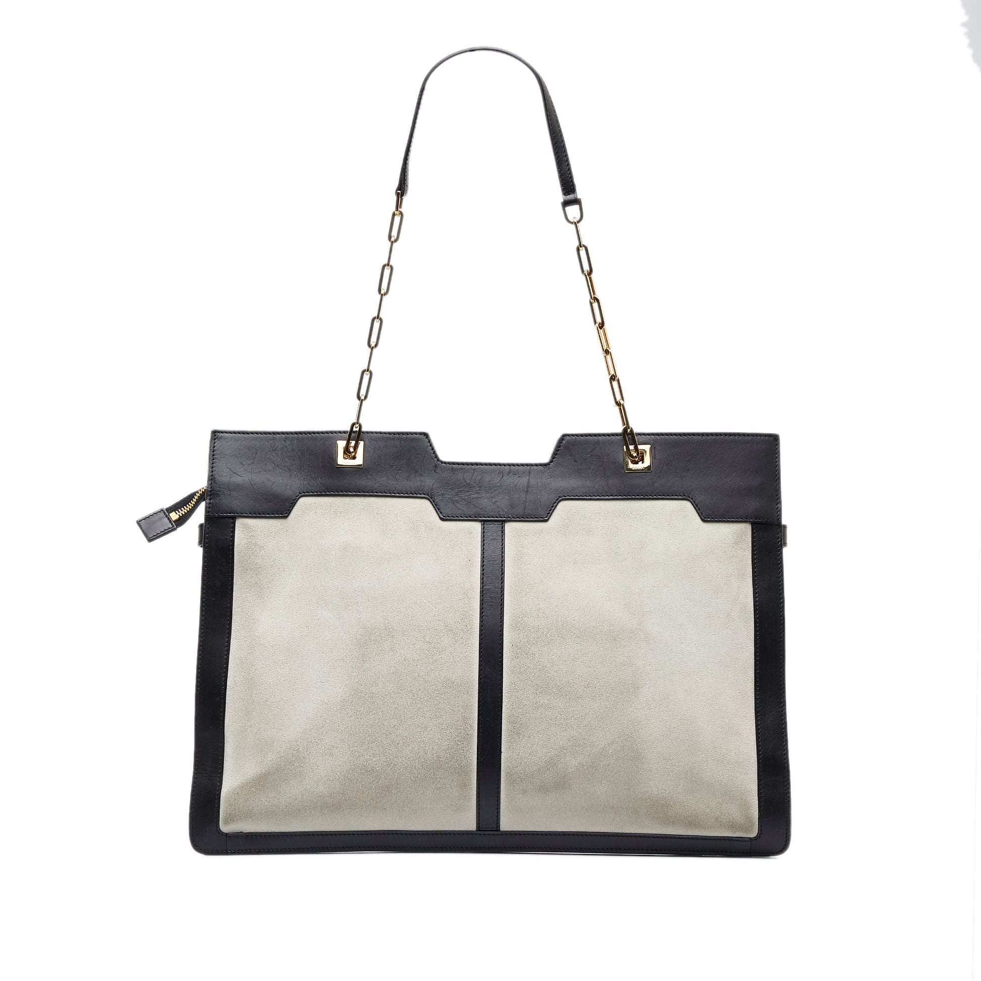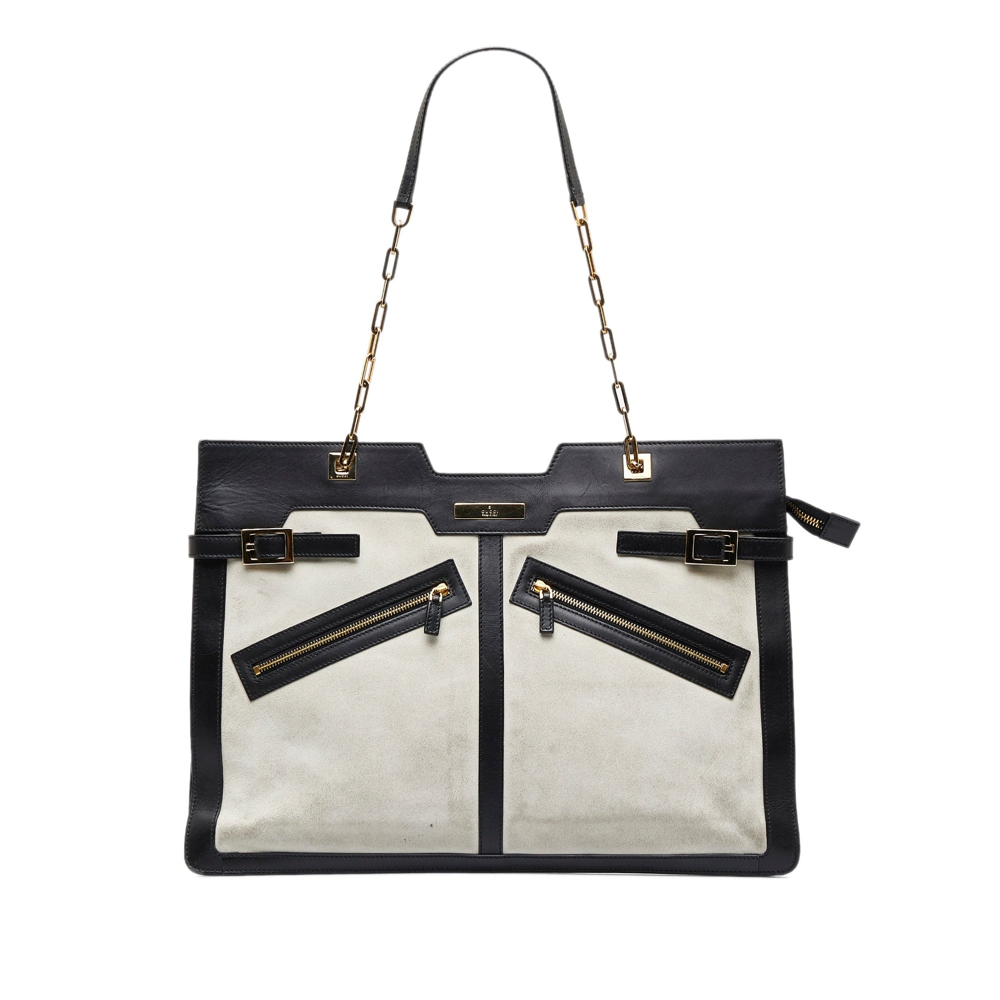 Product Details: White Gucci Suede Tote. This tote features a suede body with leather trim, chain handles with leather guards, exterior zip pockets, a top zip closure, and an interior zip pocket. 11" L x 15.4" W x 3" D, 10" drop. Serial number 001 4106 2684.