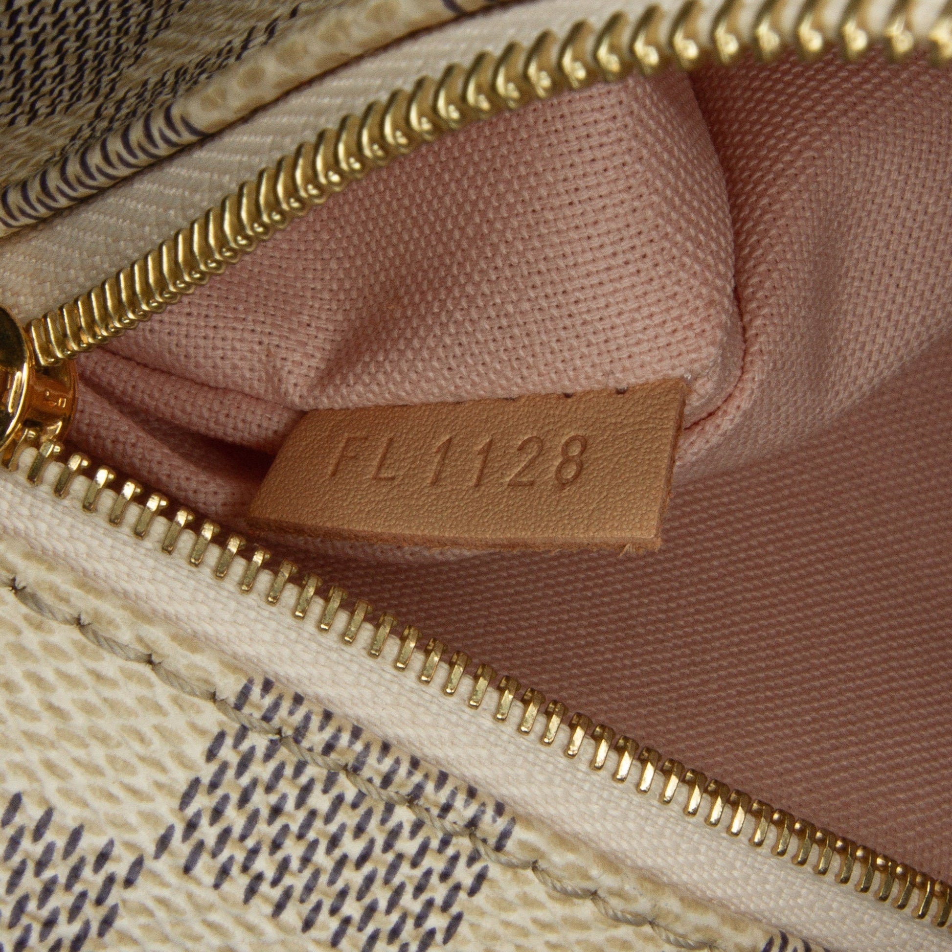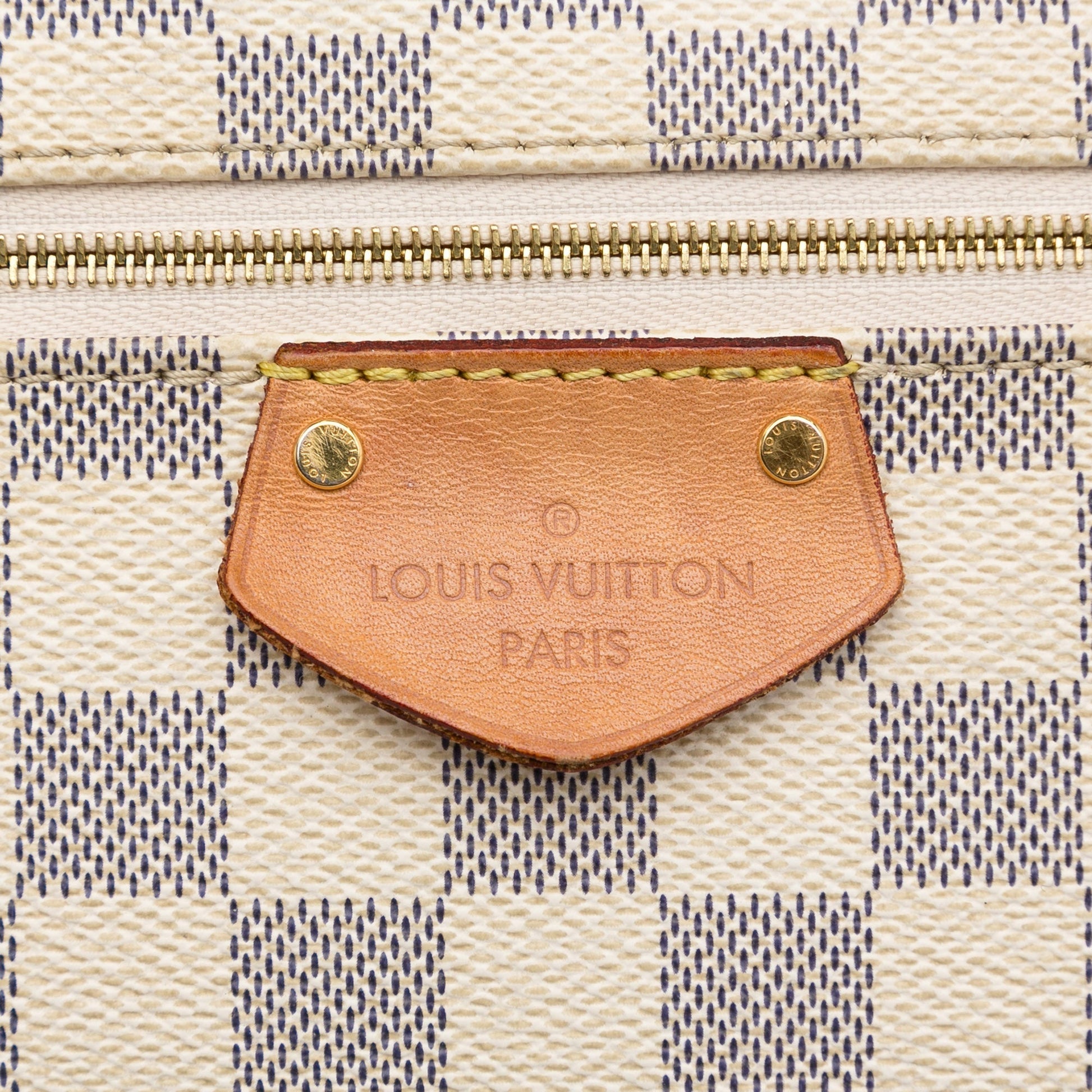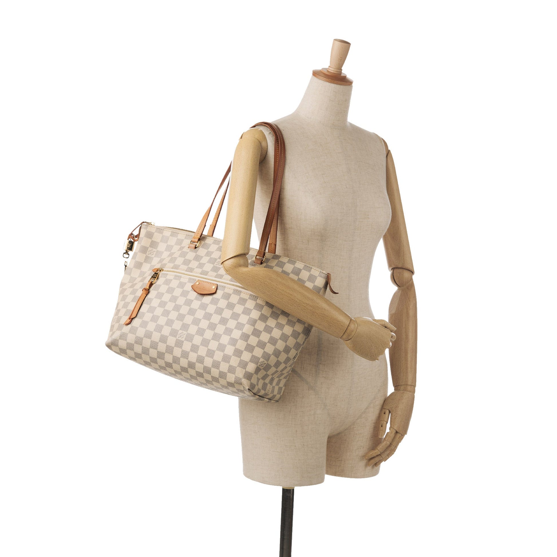 Product Details: White Louis Vuitton Damier Azur Iena MM Tote Bag. The Iena MM features a damier azur canvas body, an exterior zip pocket, flat leather straps, a top zip closure, and interior slip pockets. 10.5" L x 11.9" W x 6.4" D. Serial number FL1128.