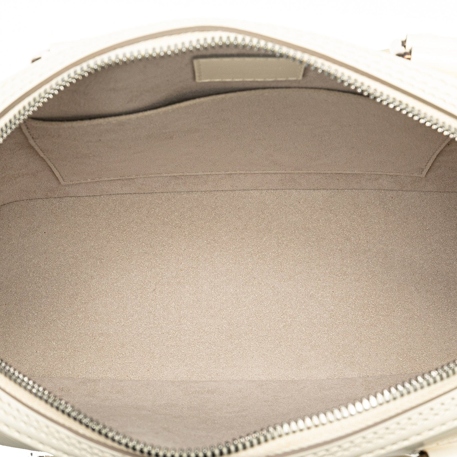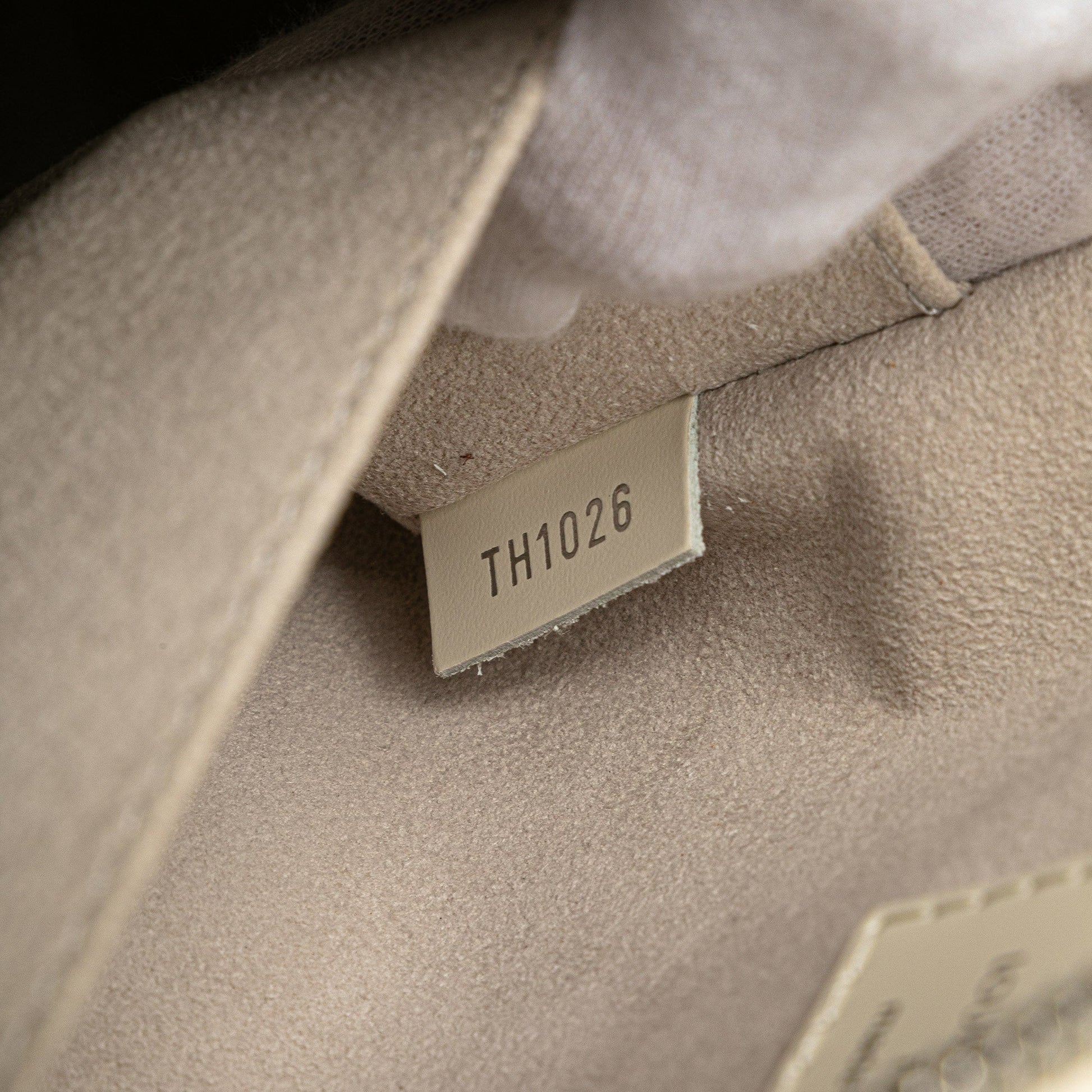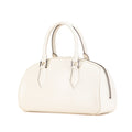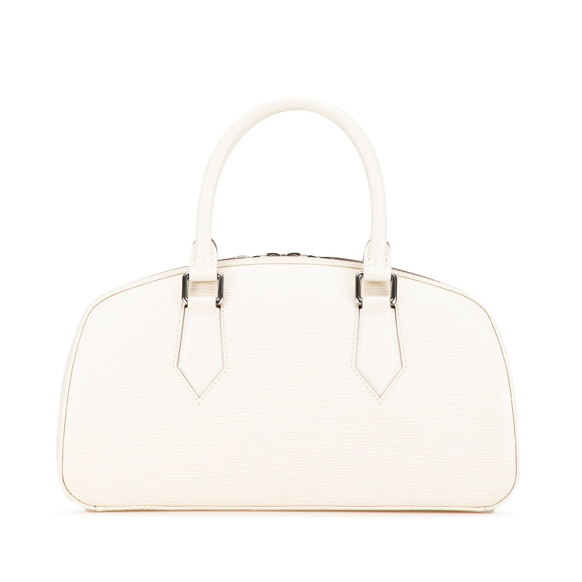 Product Details: White Louis Vuitton Epi Jasmine Handbag. The Jasmine features an epi leather body, rolled leather handles, a top zip closure, and an interior slip pocket. 7.1" L x 12.6" W x 3.9" D, 3.9" drop. Serial number TH1026.