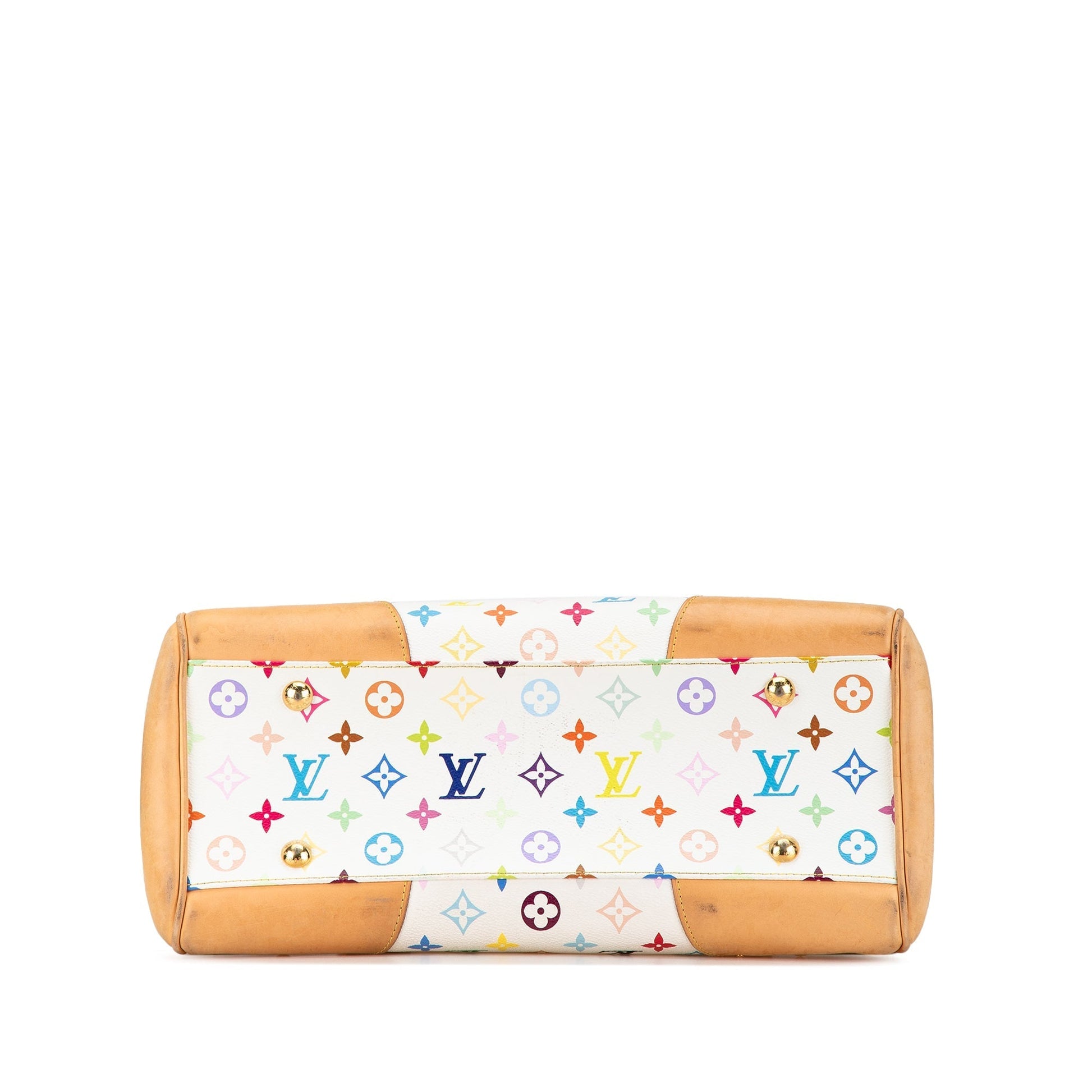 Product Details: White Louis Vuitton Monogram Multicolore Beverly GM Handbag. The Beverly GM features a monogram multicolore canvas body, rolled leather handles, a front flap with a gold-tone buckle closure, and interior slip and flap pockets. 9.4" L x 14.6" W x 7.1" D, 4.7" drop. Serial number DU1068.