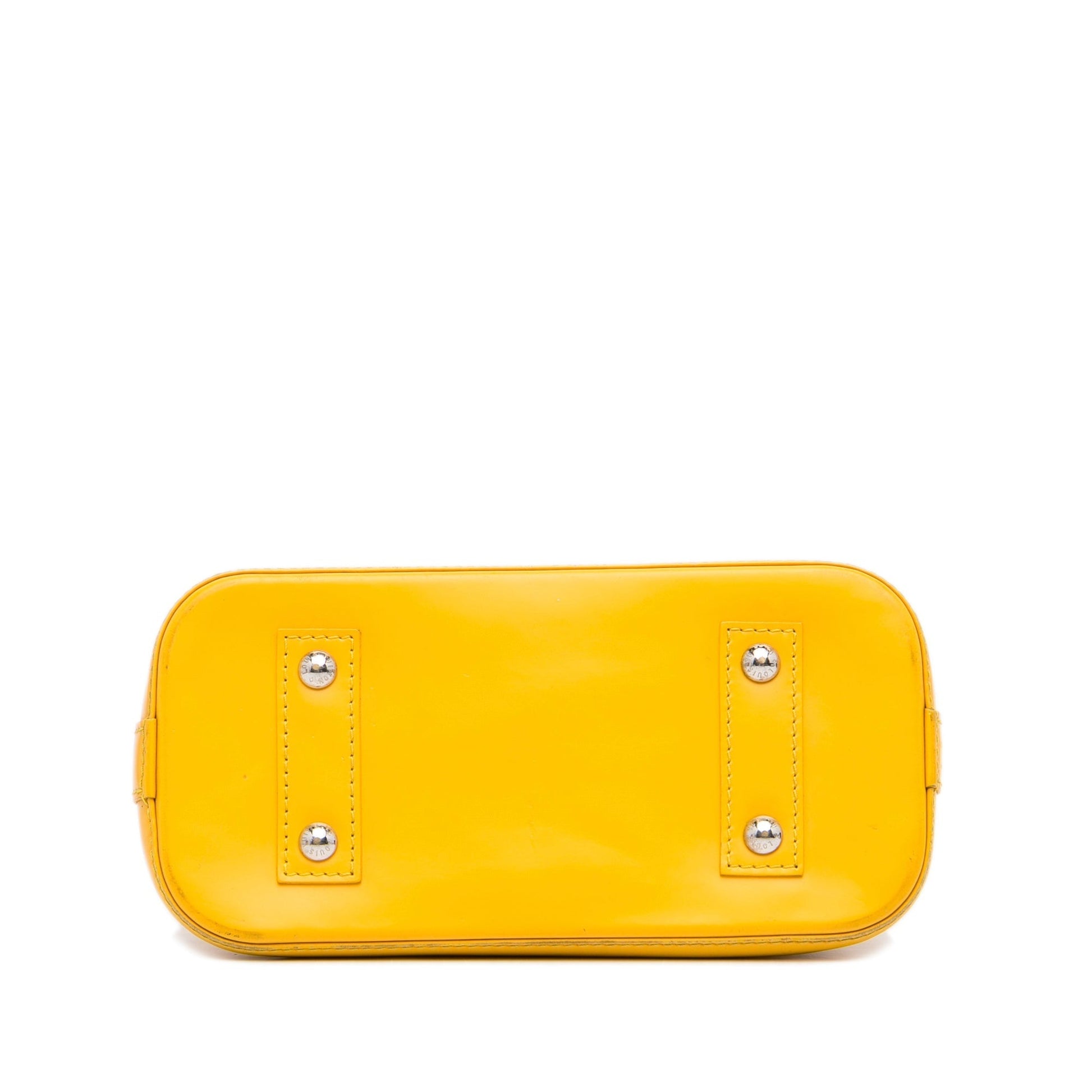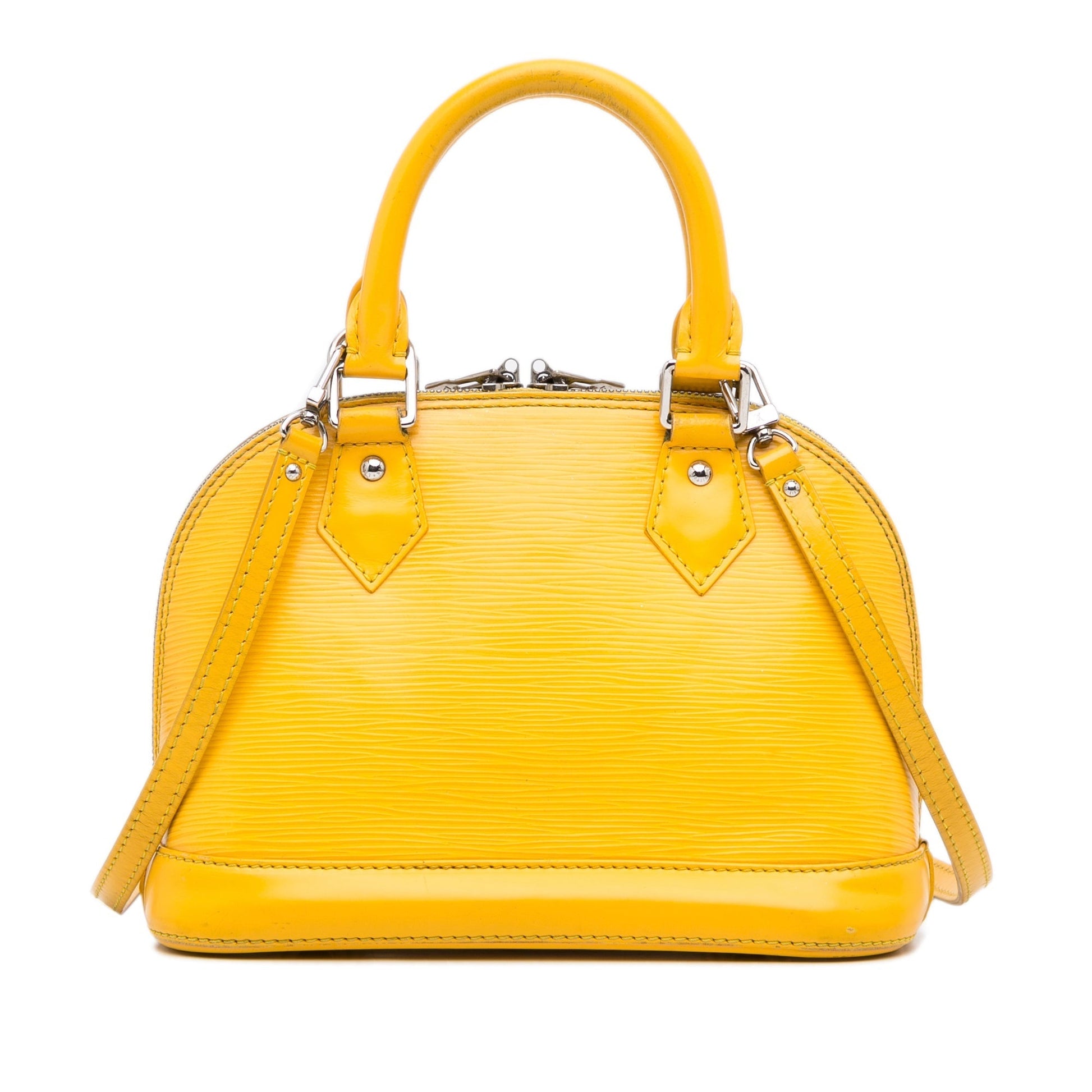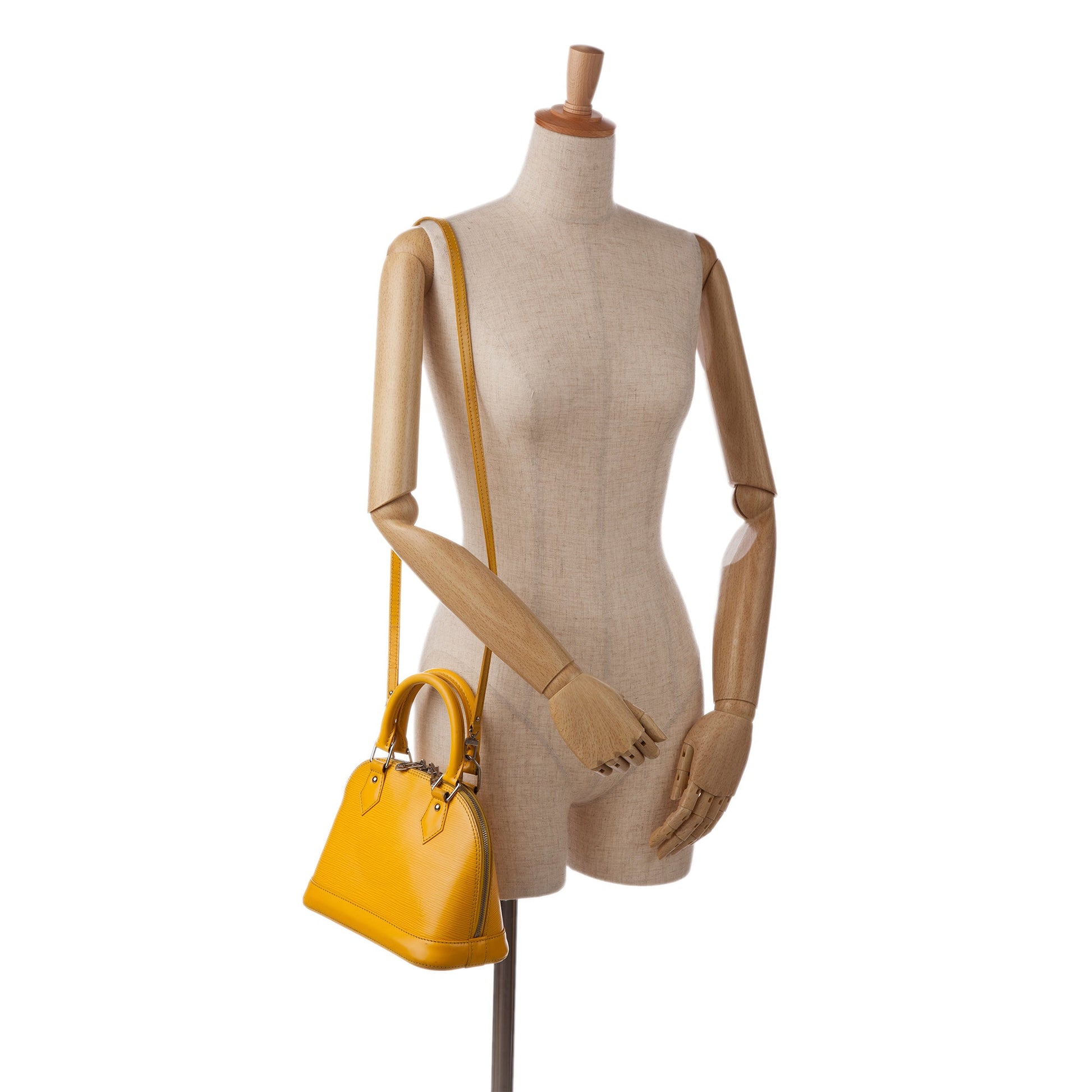 Product Details: Yellow Louis Vuitton Epi Alma BB Satchel. The Epi Alma BB features an epi leather body, rolled top handles, a detachable flat leather strap, a top zip closure, and an interior slip pocket. 6.7" L x 9.1" W x 4.3" D, 3.9" drop. Serial number FL2173.