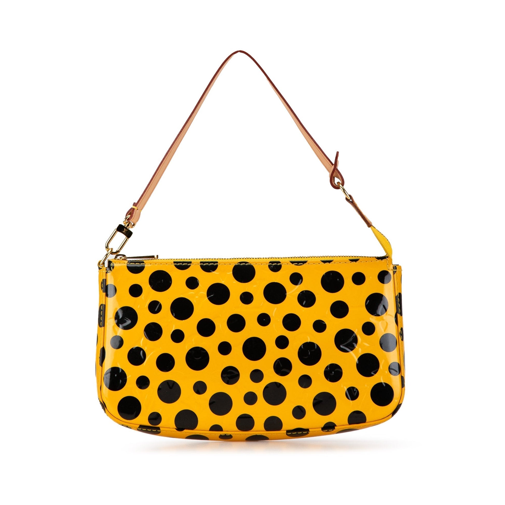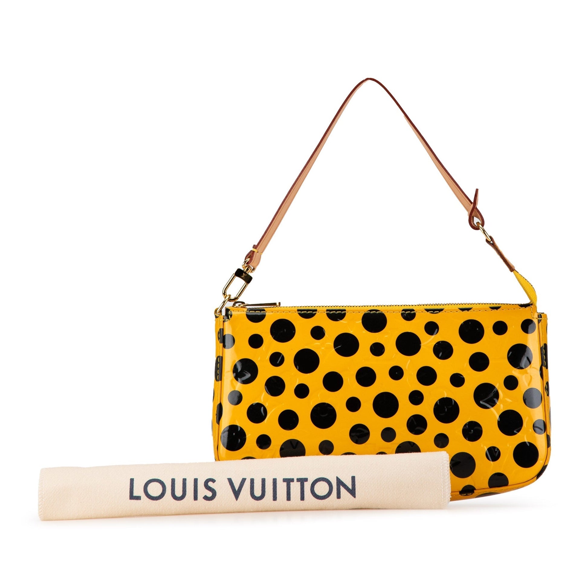 Product Details: Yellow Louis Vuitton x Yayoi Kusama Monogram Vernis Dots Infinity Pochette Accessoires Shoulder Bag. The Pochette Accessoires features a vernis leather body, a flat vachetta strap, a top zip closure, and an interior slip pocket. 5.1" L x 8.7" W x 1.6" D. Serial number DR3152.