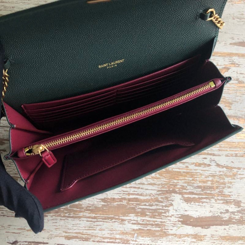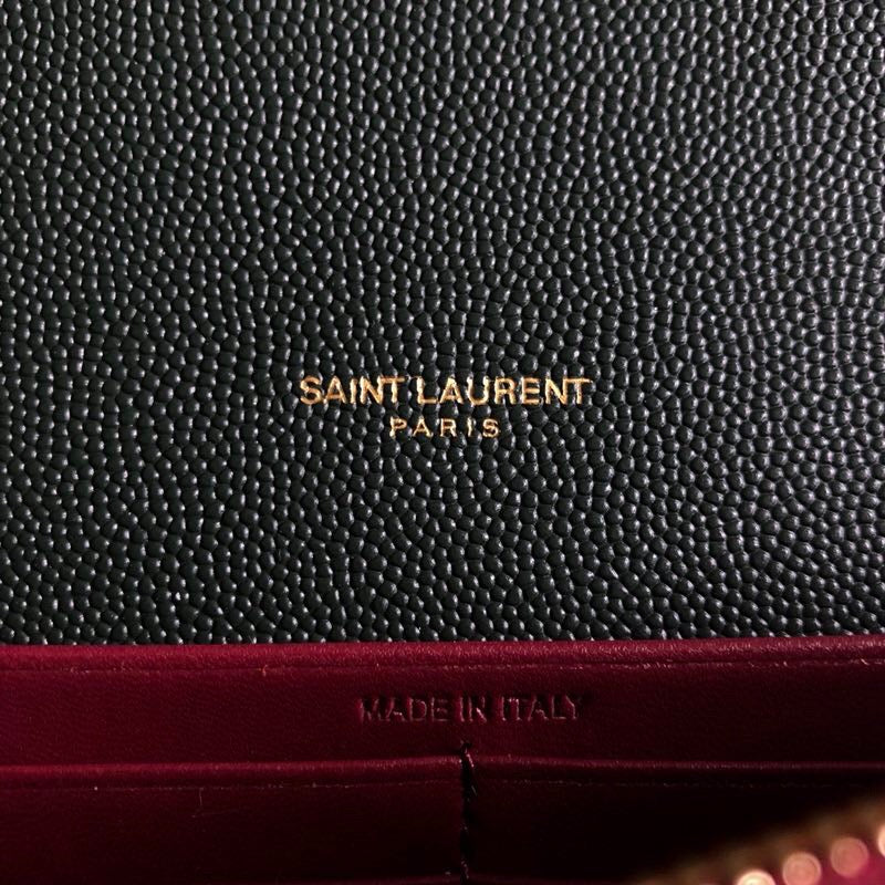 S.L monogram bag made with metal-free tanned and organic cotton lining, featuring a flap on front and studs on the sides, two compartmtlmts, a flat pocket in front with a pivoting ysl fasttlming and a double curb chain.